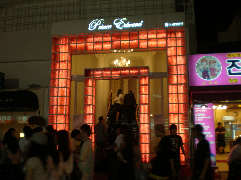 The light, music, & goods galore fill the streets of Hongdae. Including both colorful people, like the guys hawking free beer for their bar andplaces, like the luxury Karaoke Norebang below.