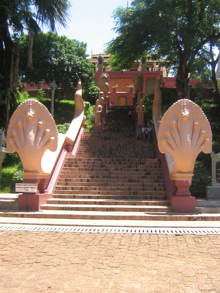 After the Killing Fields we headed back to town and made a pit stop at Wat Phnom. Wat Phnom sits atop a high hill and supposedly the first pagoda on this site housed four Buddha statues dropped off by the Mekong river and found by a young lady by the name of Penh.